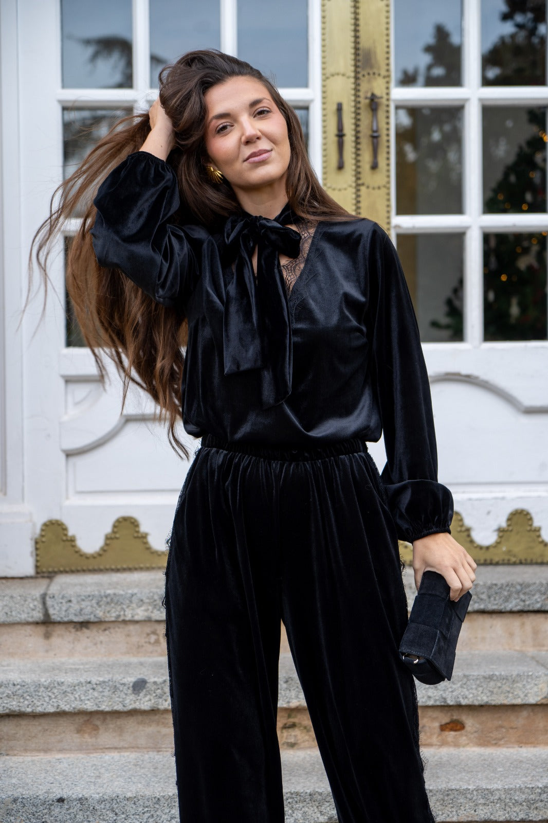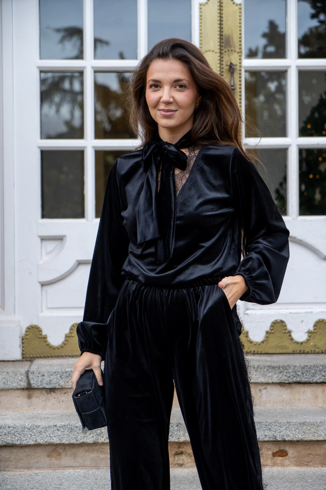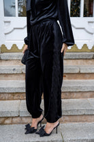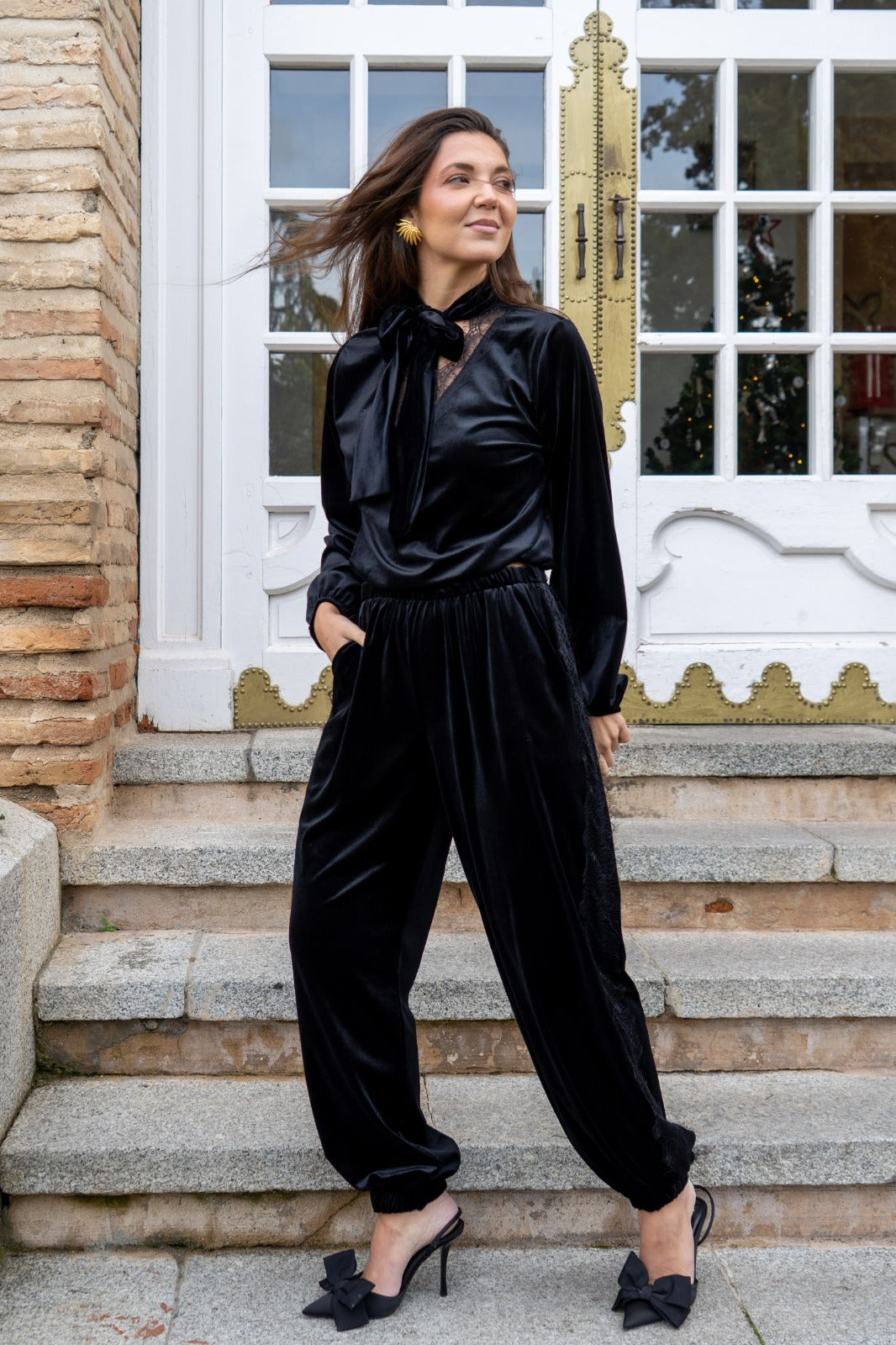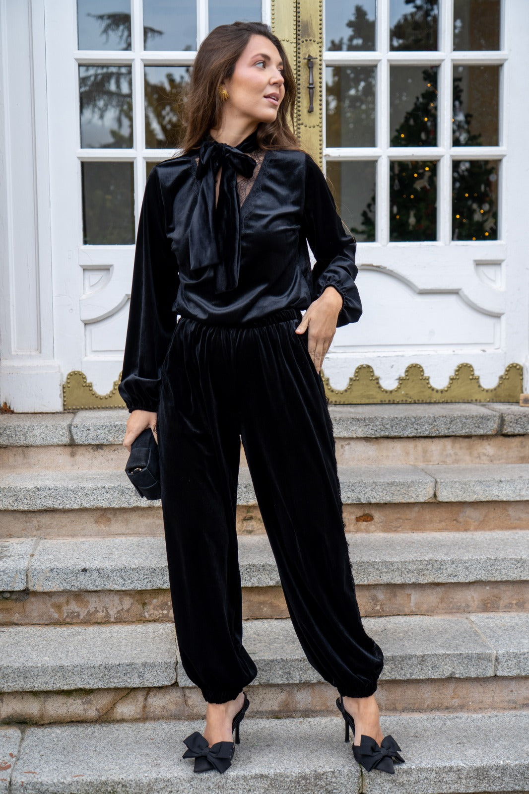Set consisting of a blouse, V-neck with lace trim, long sleeves with elasticated cuffs and harem pants, elasticated waist, lace trim on the sides, in black.
