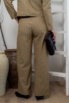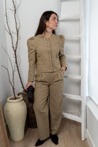Outfit consisting of a short jacket with a round neckline, buttoned, puffed long sleeves, and high-waisted trousers with front pleats and side pockets. In mustard color with a white stripe.