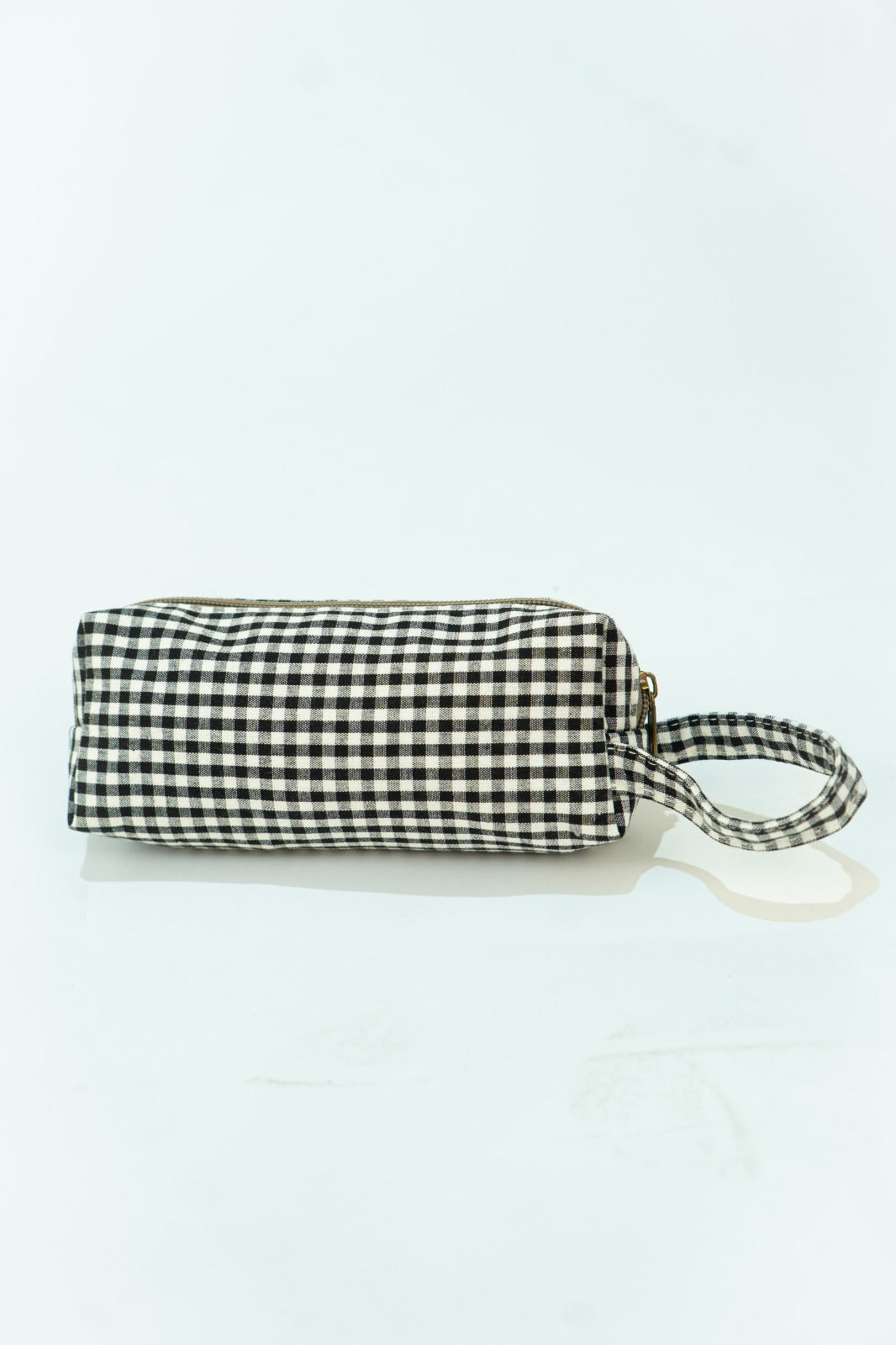 Small pencil case or toiletry bag, zip closure, side handle. In black and white gingham.