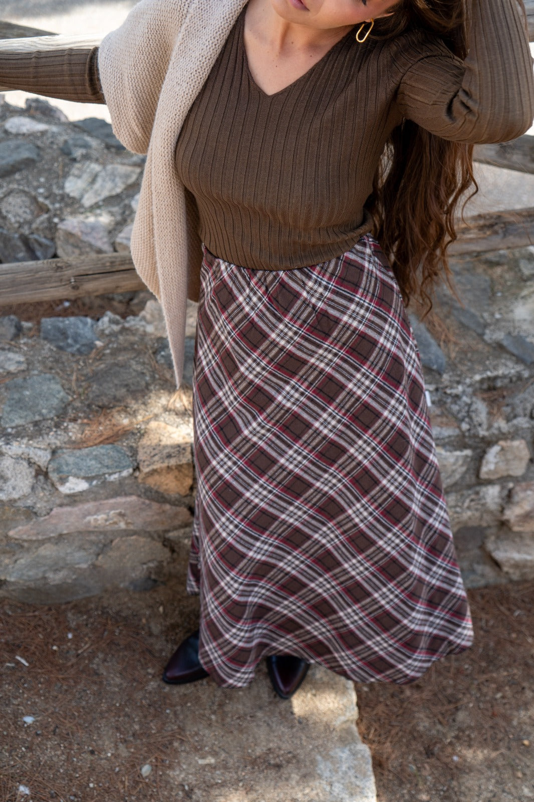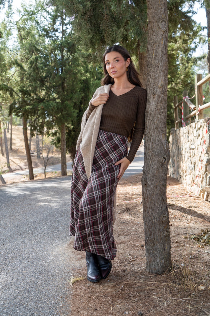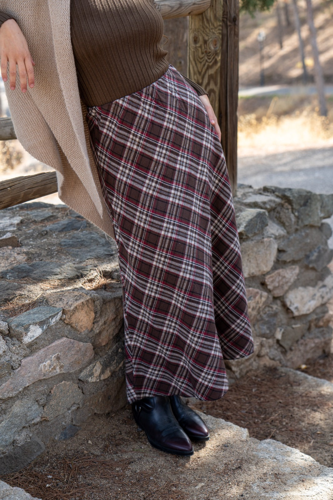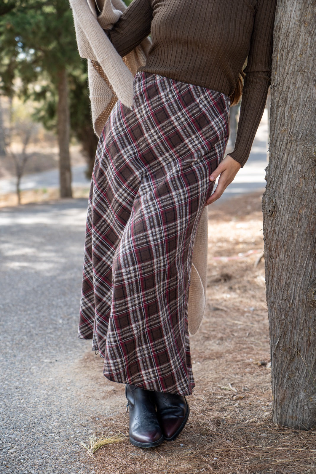 Midi skirt, elasticated waist, in brown, red and beige checks.