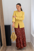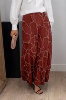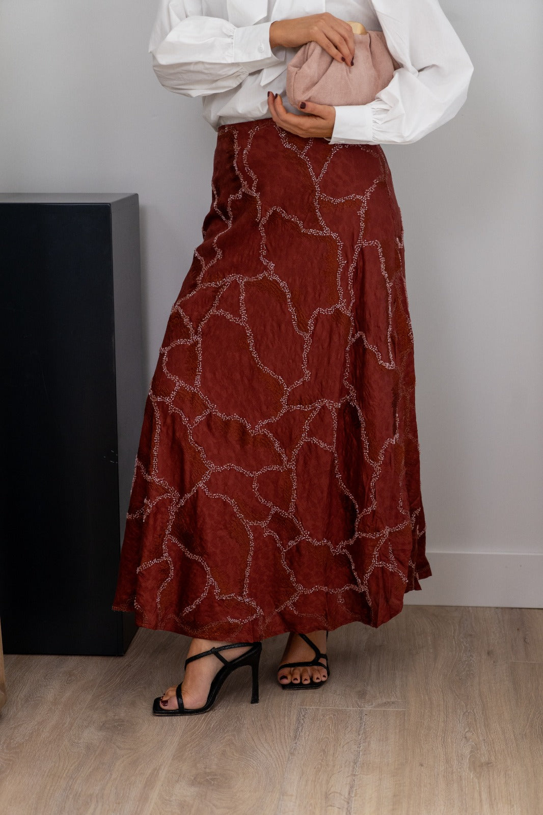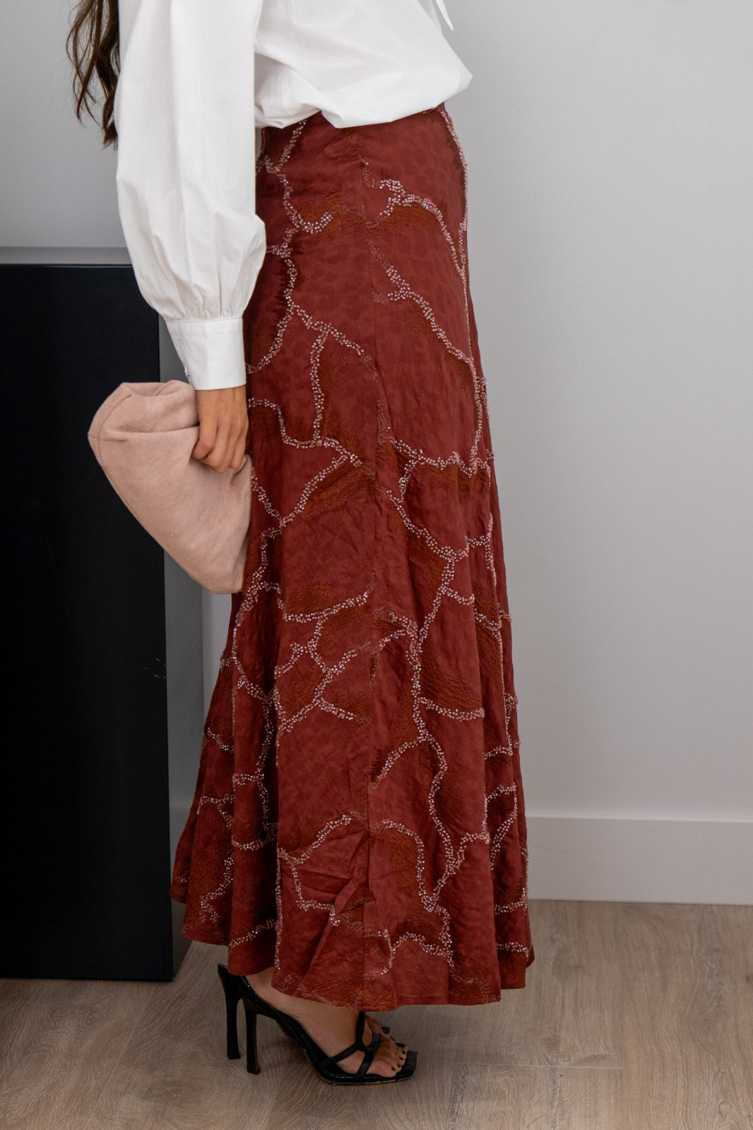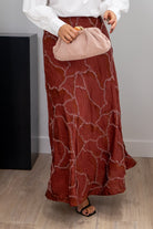 Fala maxi midi, cintura alta, movimiento abajo, En color teja con bordado.