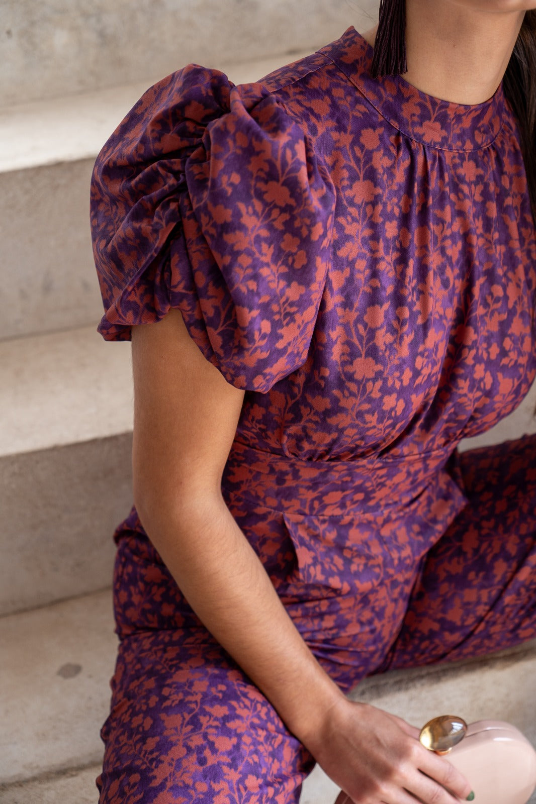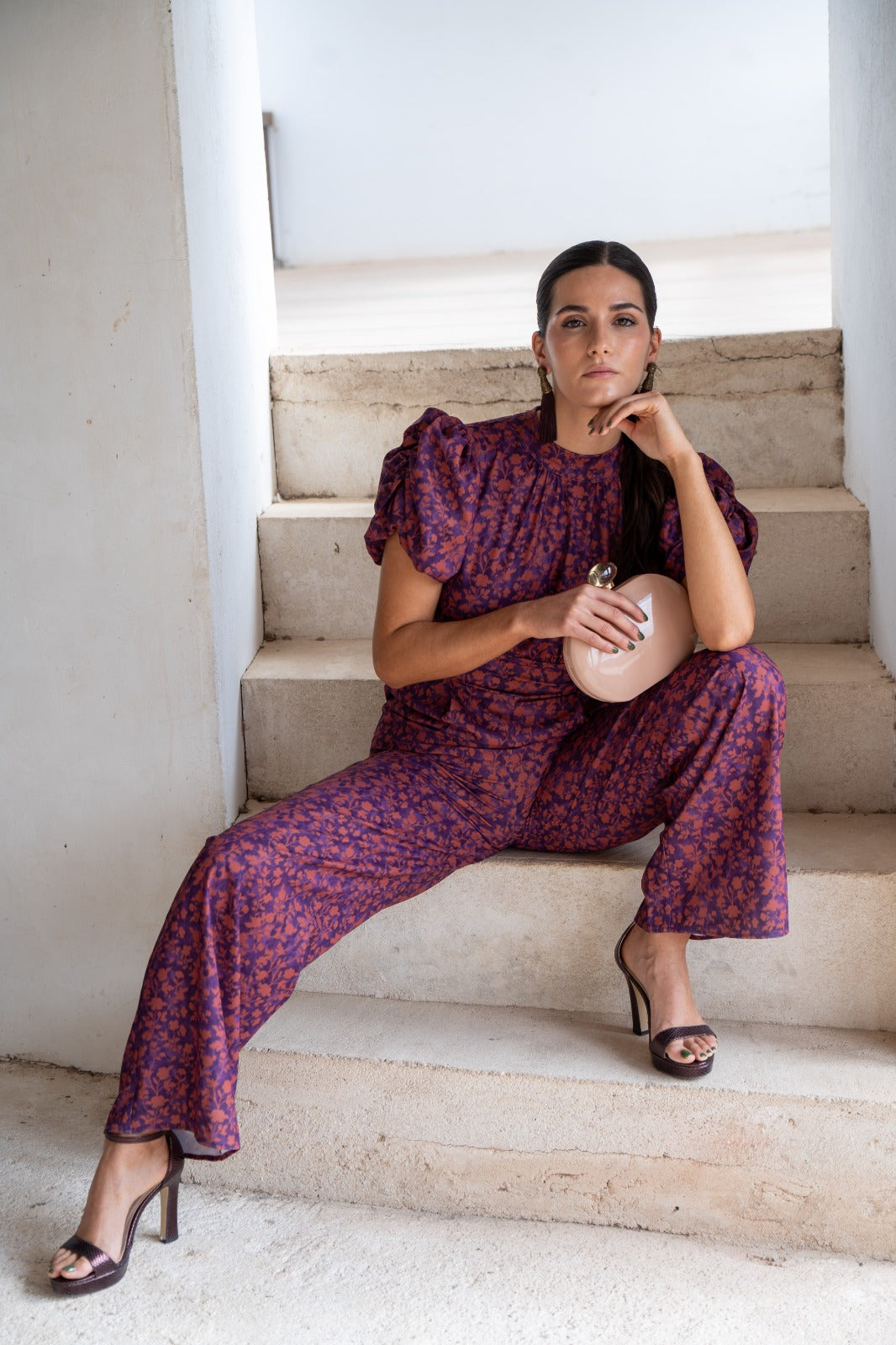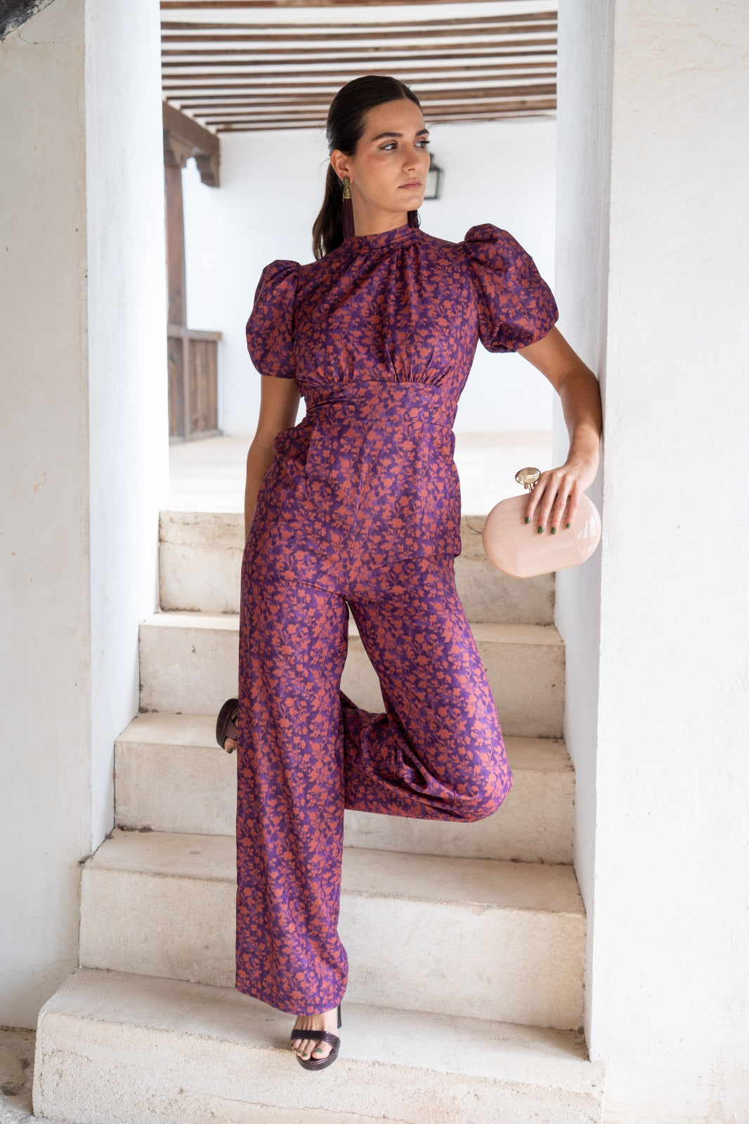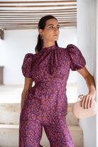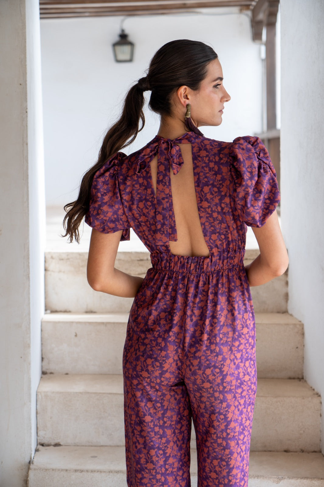 Jumpsuit with high neckline tied at the back, short puff sleeves, open back, fitted waist, wide hem. Purple and terracotta print.