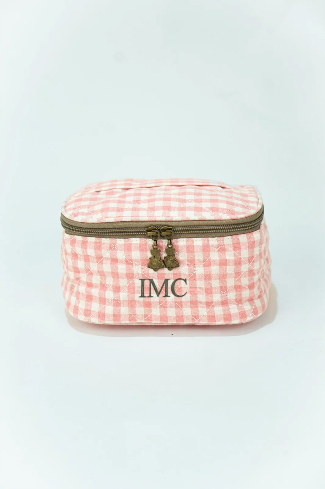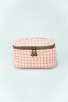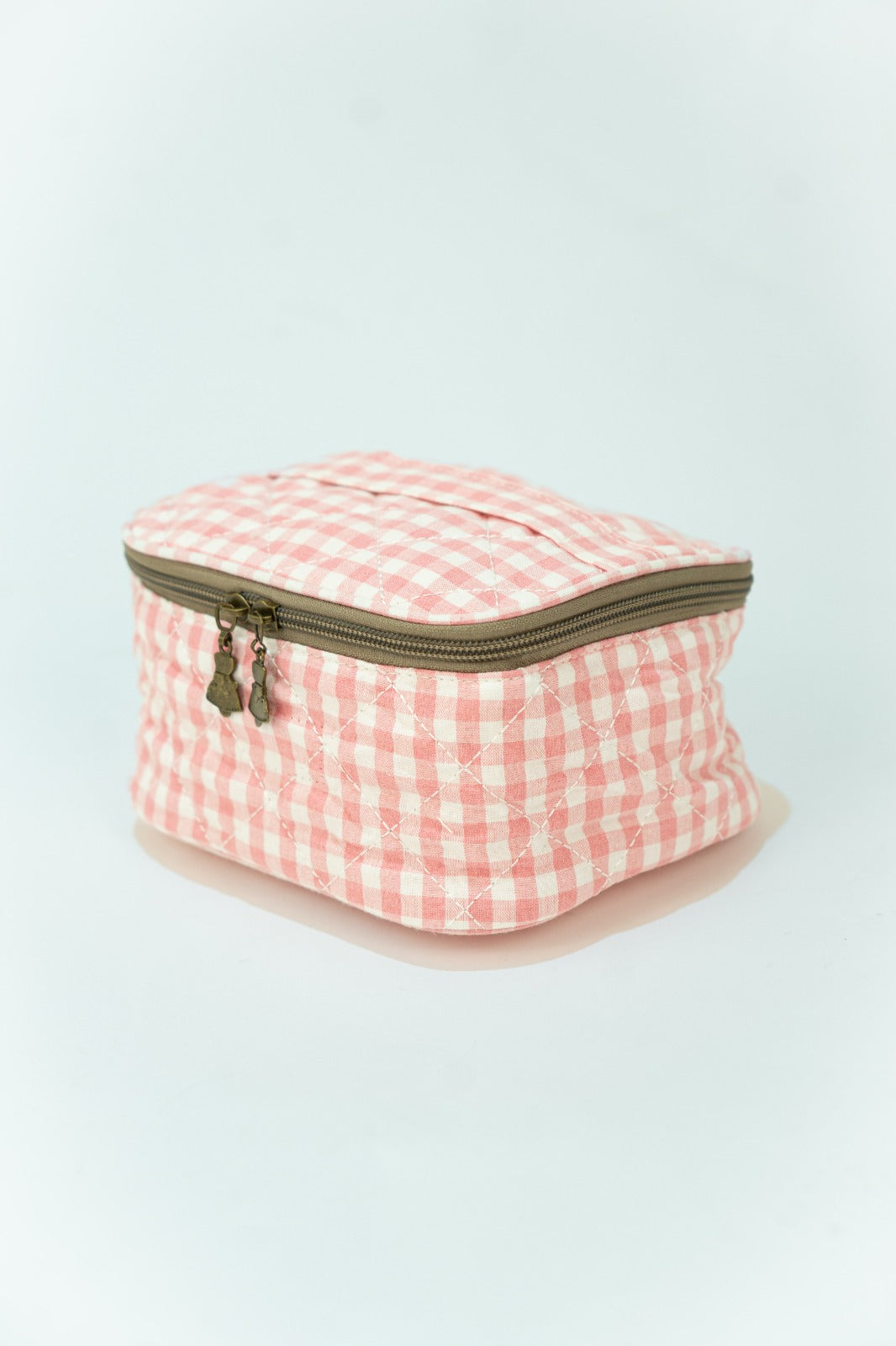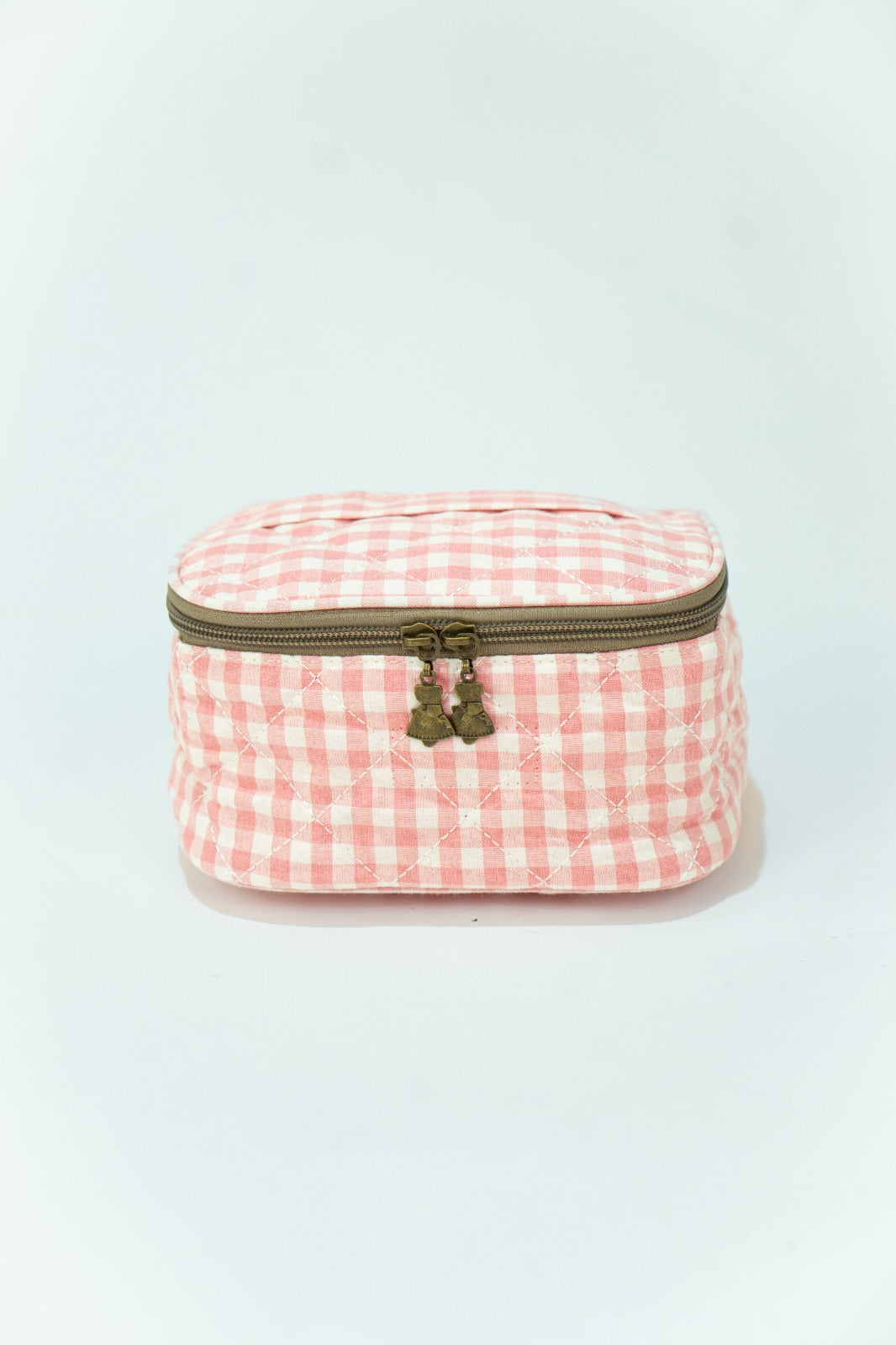 Toiletry bag with zip closure, handle at the top, interior pockets, in white and pink gingham.