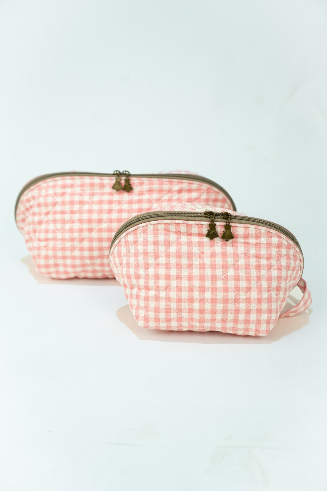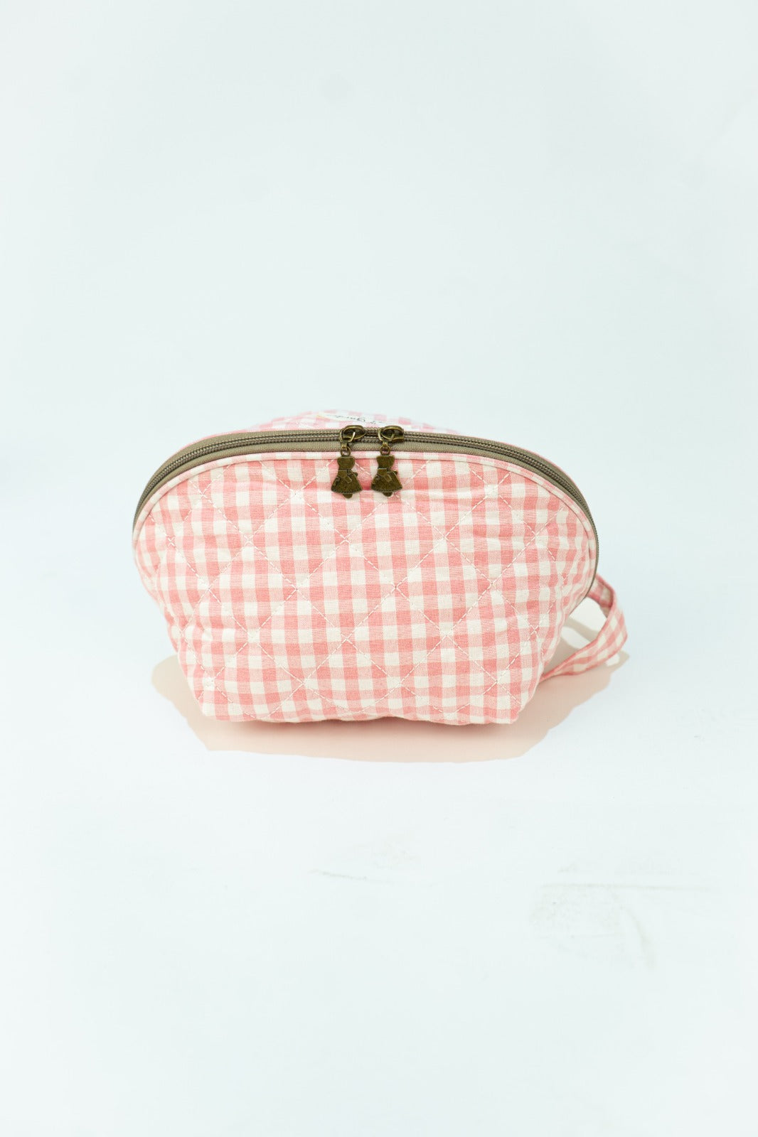 Toiletry bag with zip closure, handle on one side, in white and pink gingham.