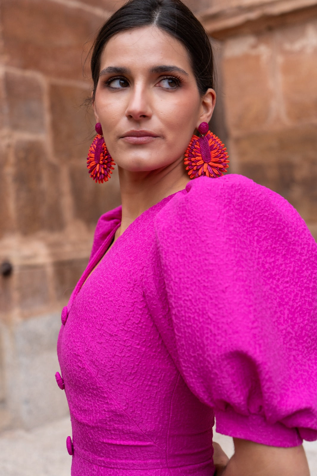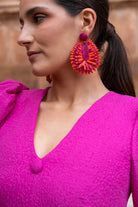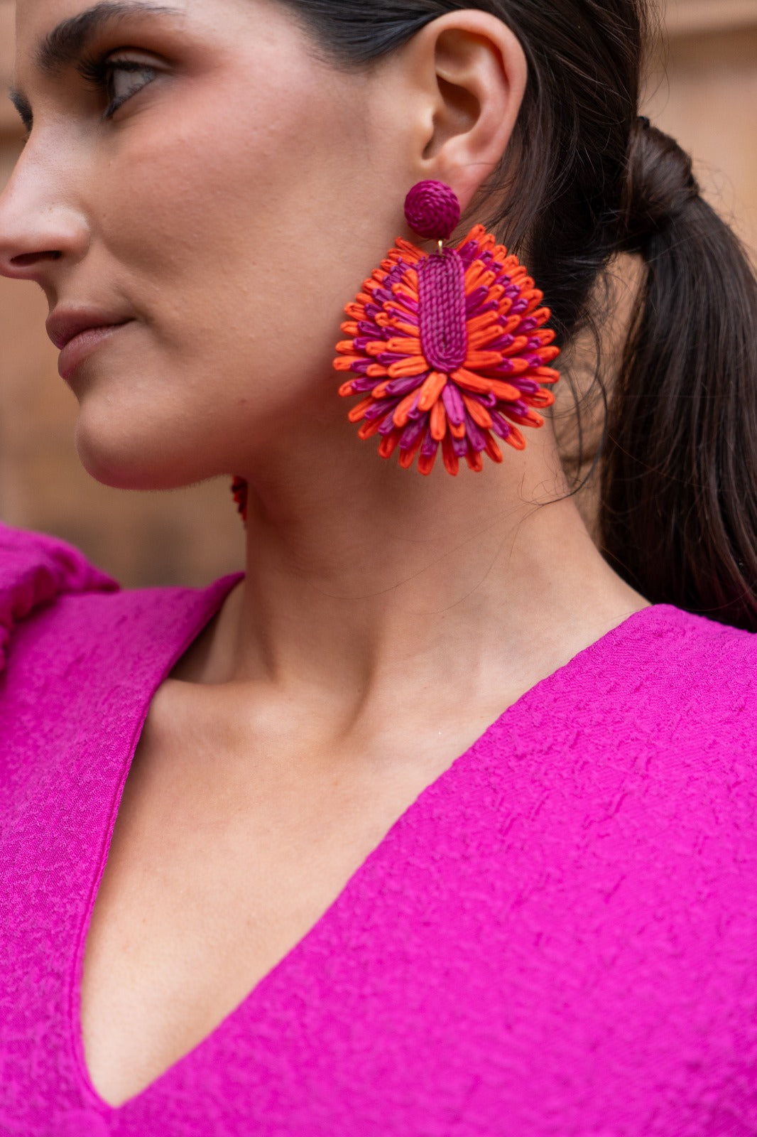 Pendientes bicolor morado y naranja, combinado en tejidos. cierre con tuerca.