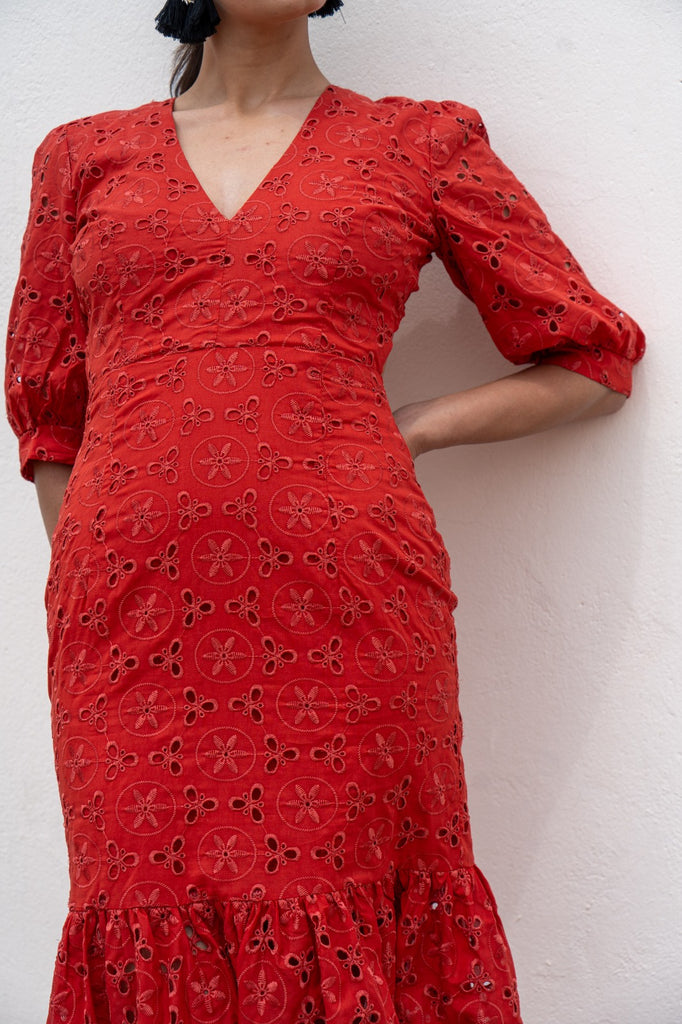 V-neck dress, open back, short sleeves, and a ruffle at the bottom. Openwork and embroidery in a boiler-colored finish.