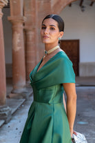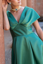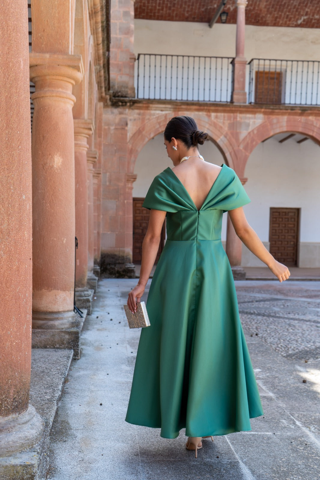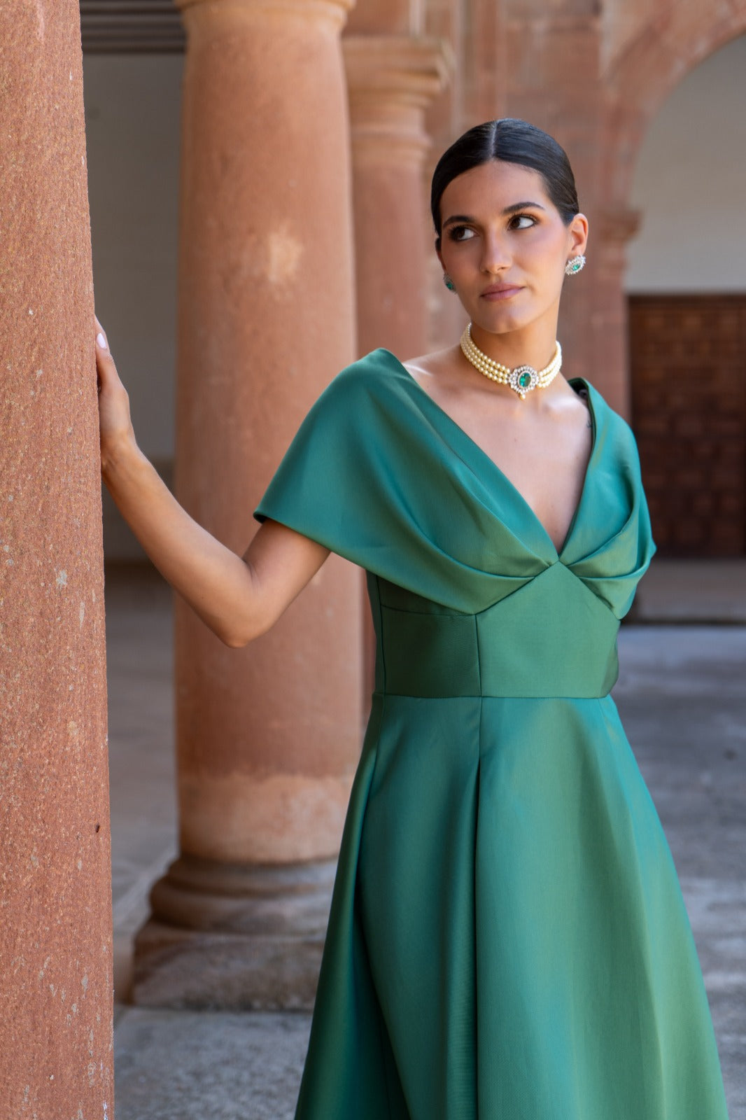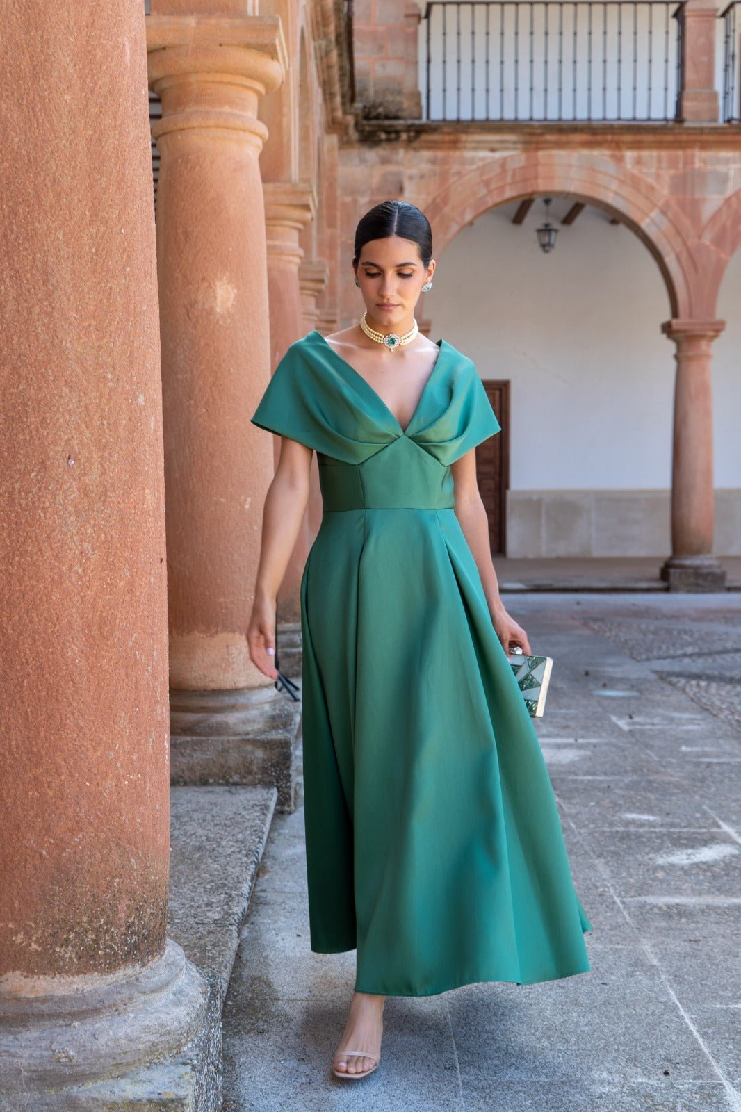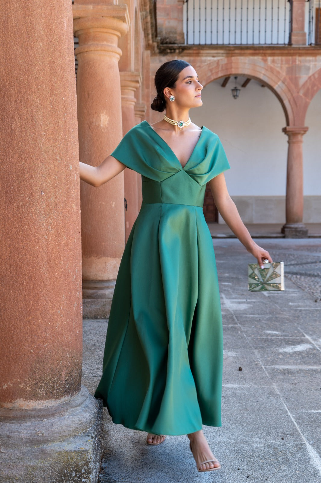 Long dress, V-neck, dropped shoulder, fitted waist, flared skirt. Made of stiff green fabric.