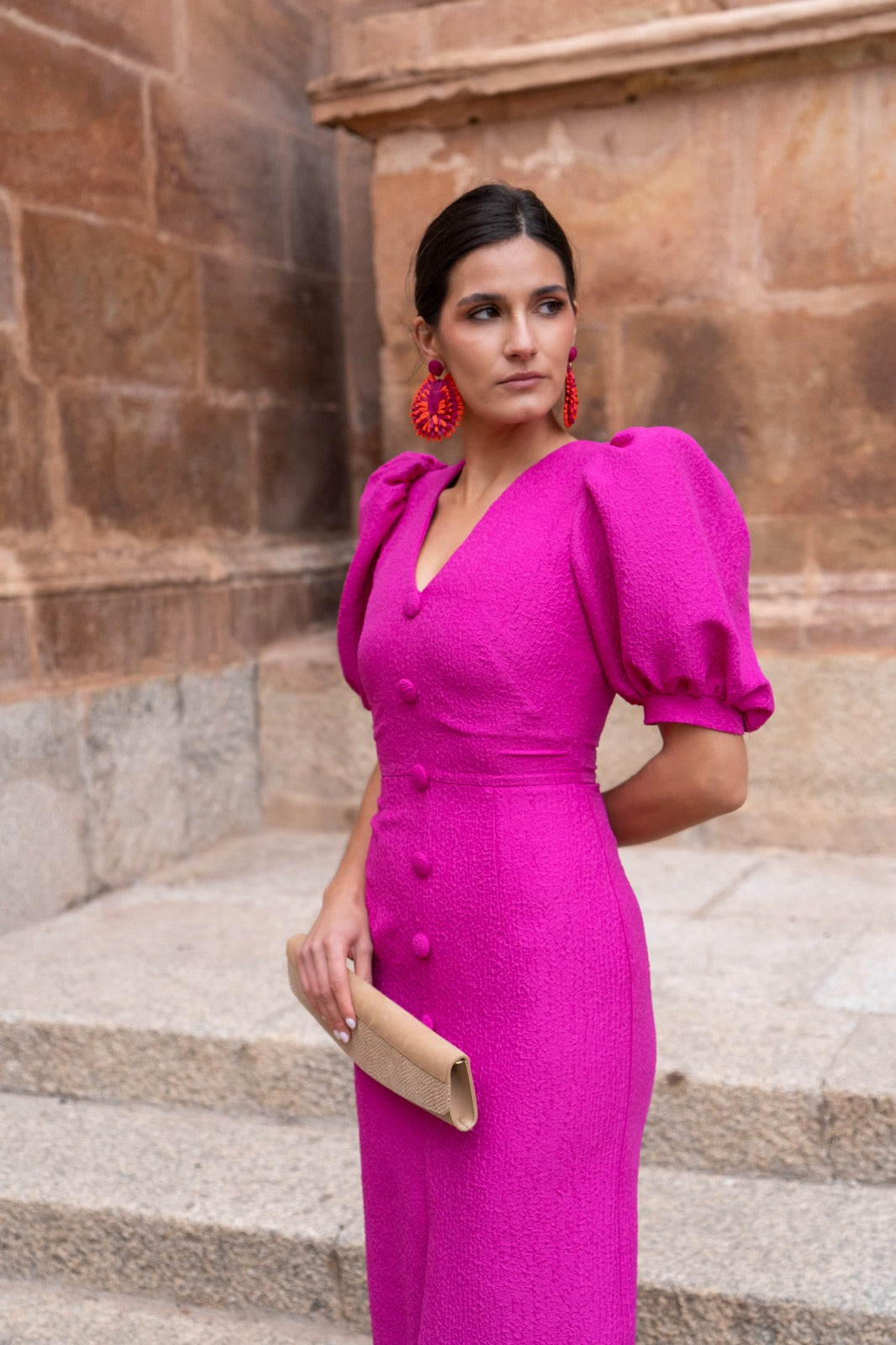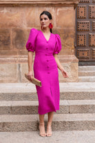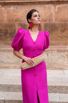 Vestido midi, escote en forma de V, manga corta abullonada, detalle botones delanteros (no se abren), abertura delantera. En color buganvilla.