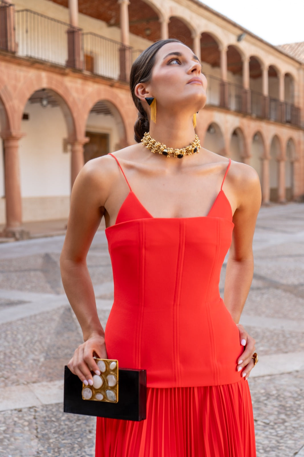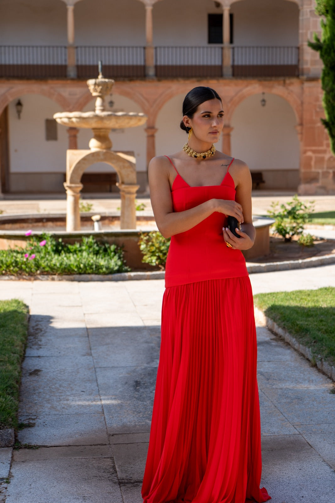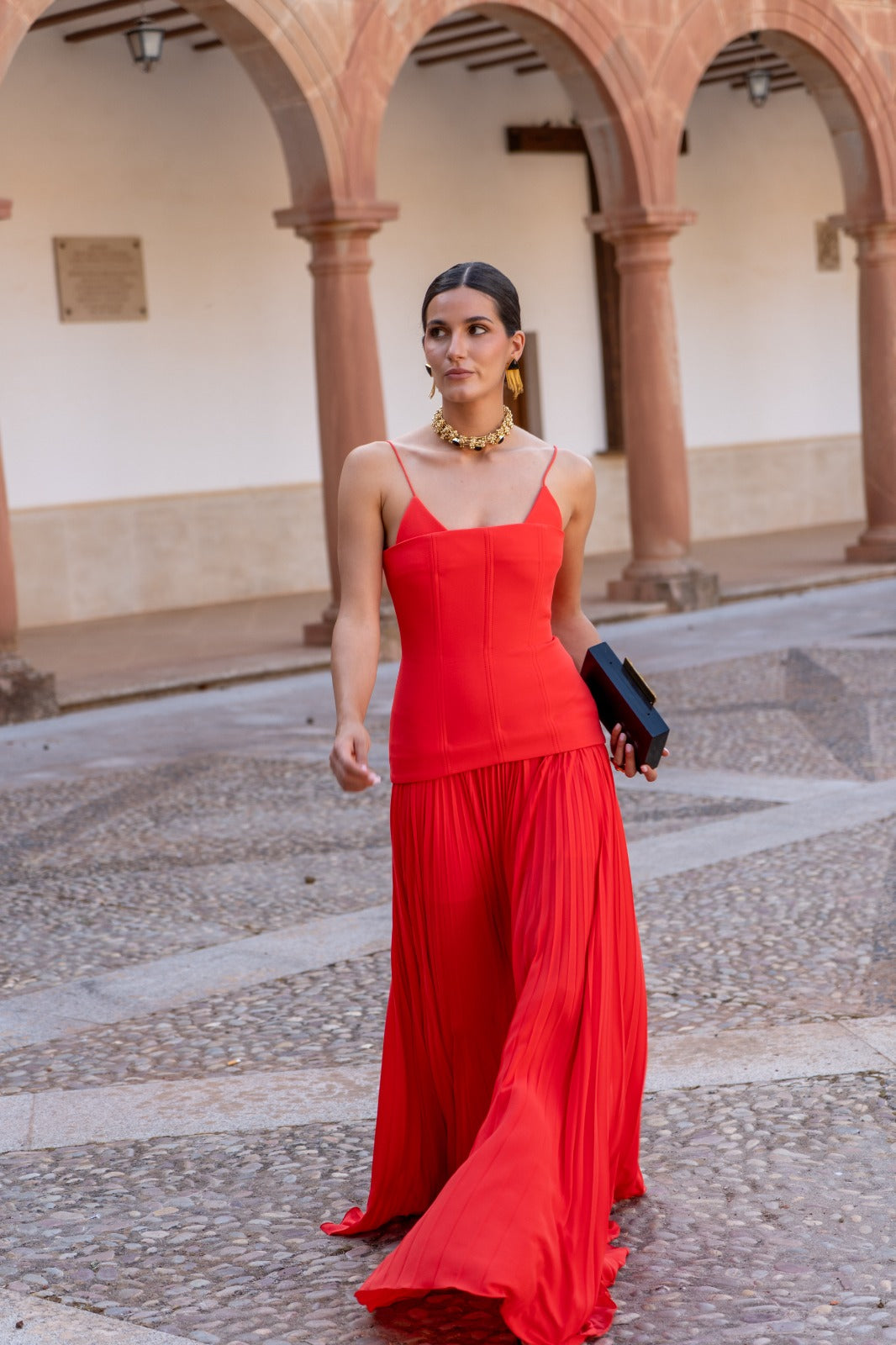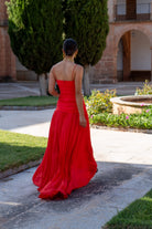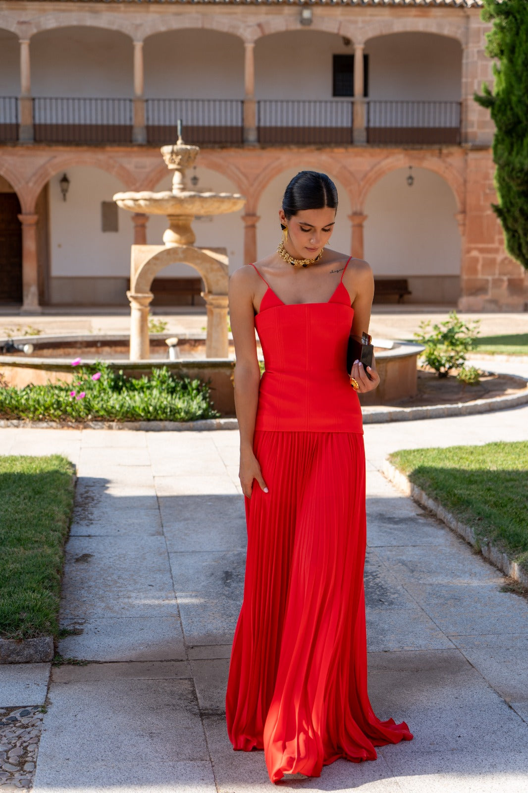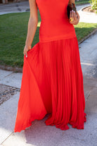 Long crepe dress with a stitched corset bodice that is attached to the pleated skirt. In coral.