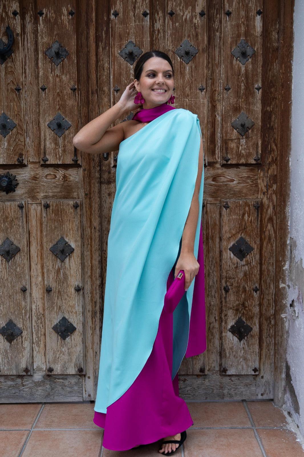 Long, asymmetrical dress, fuchsia at the bottom, a water-green cape over the top, and a bow at the neck. Two-tone pink and green.