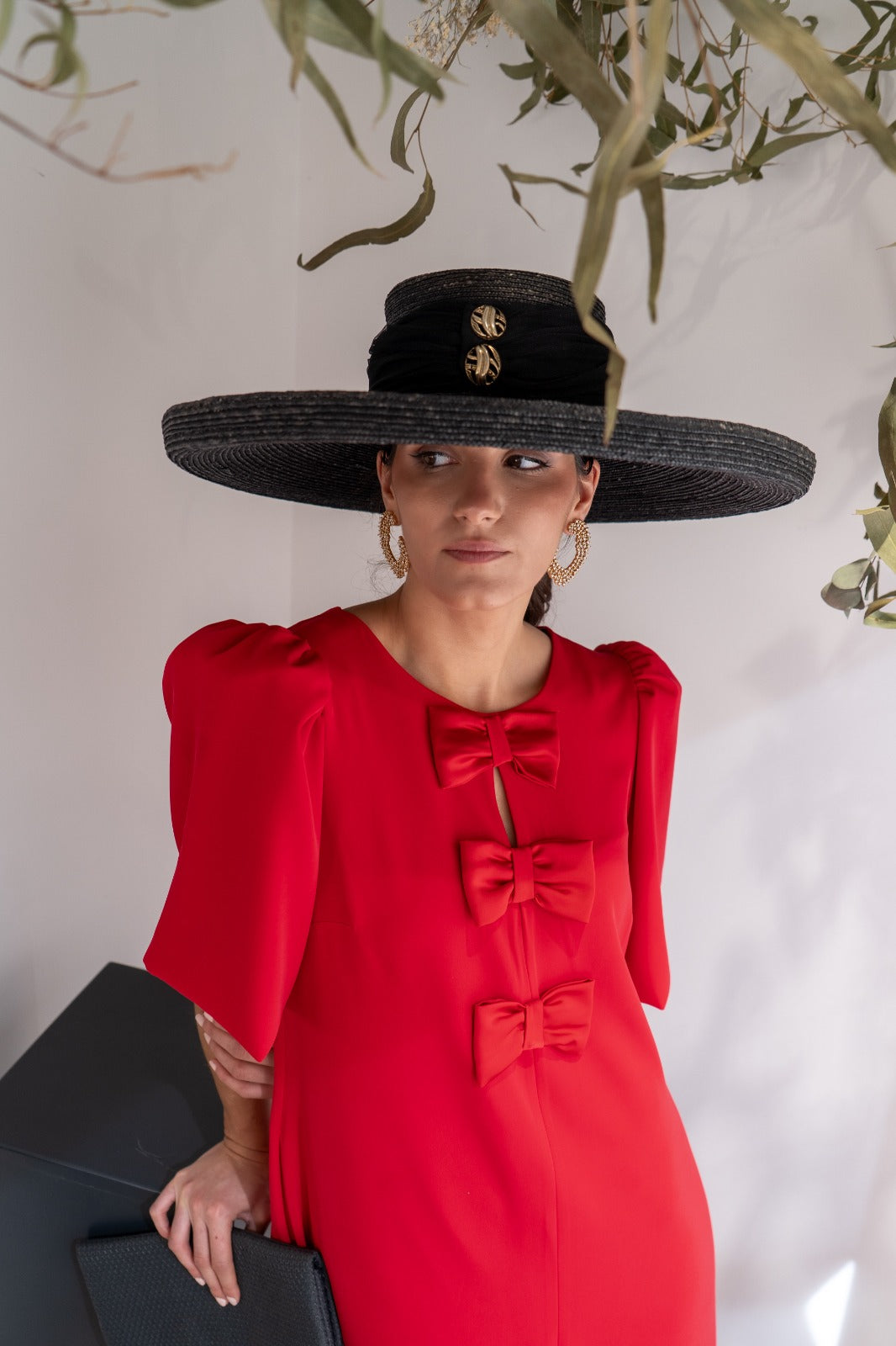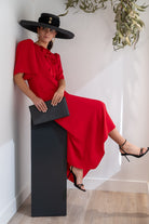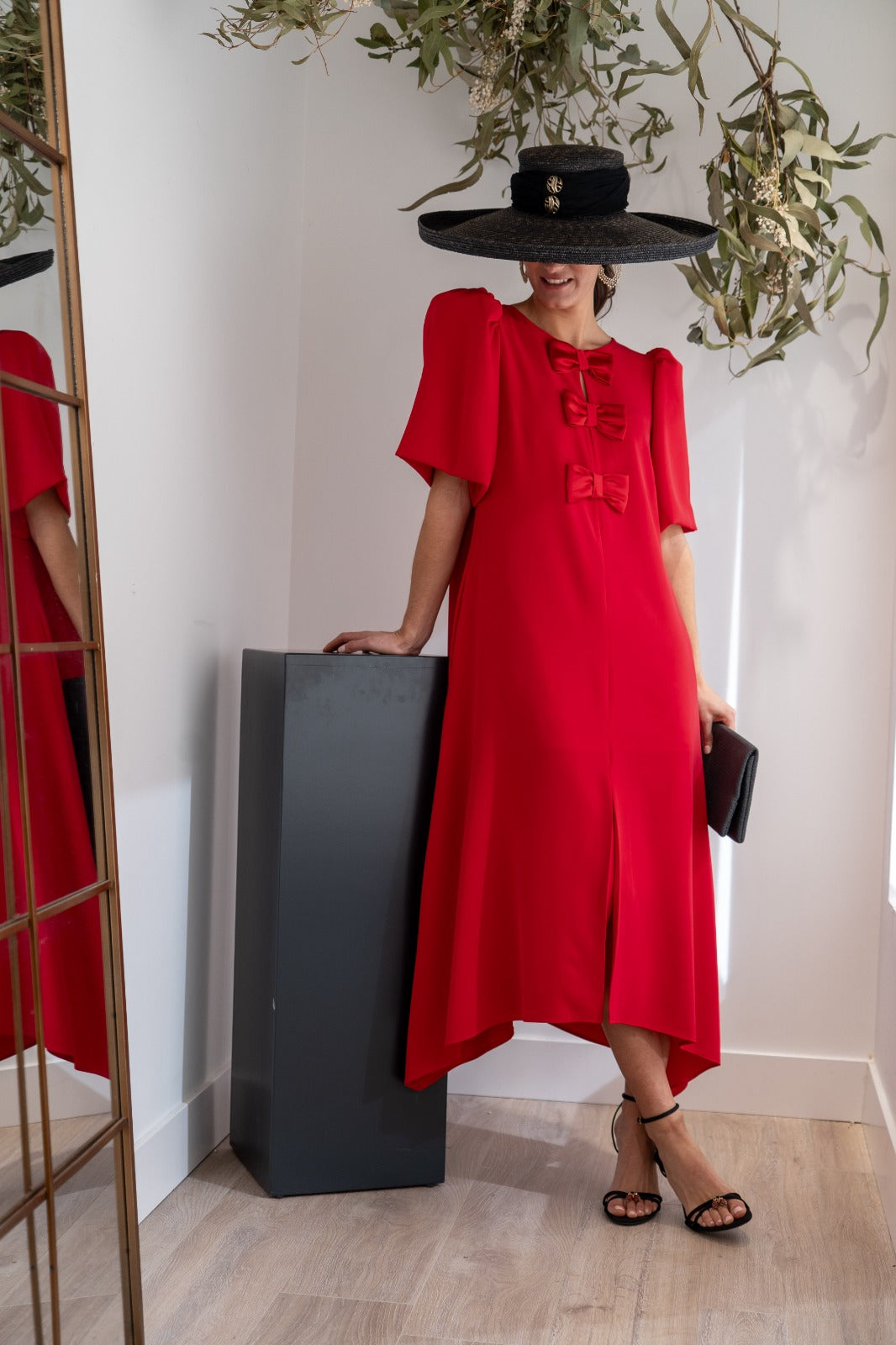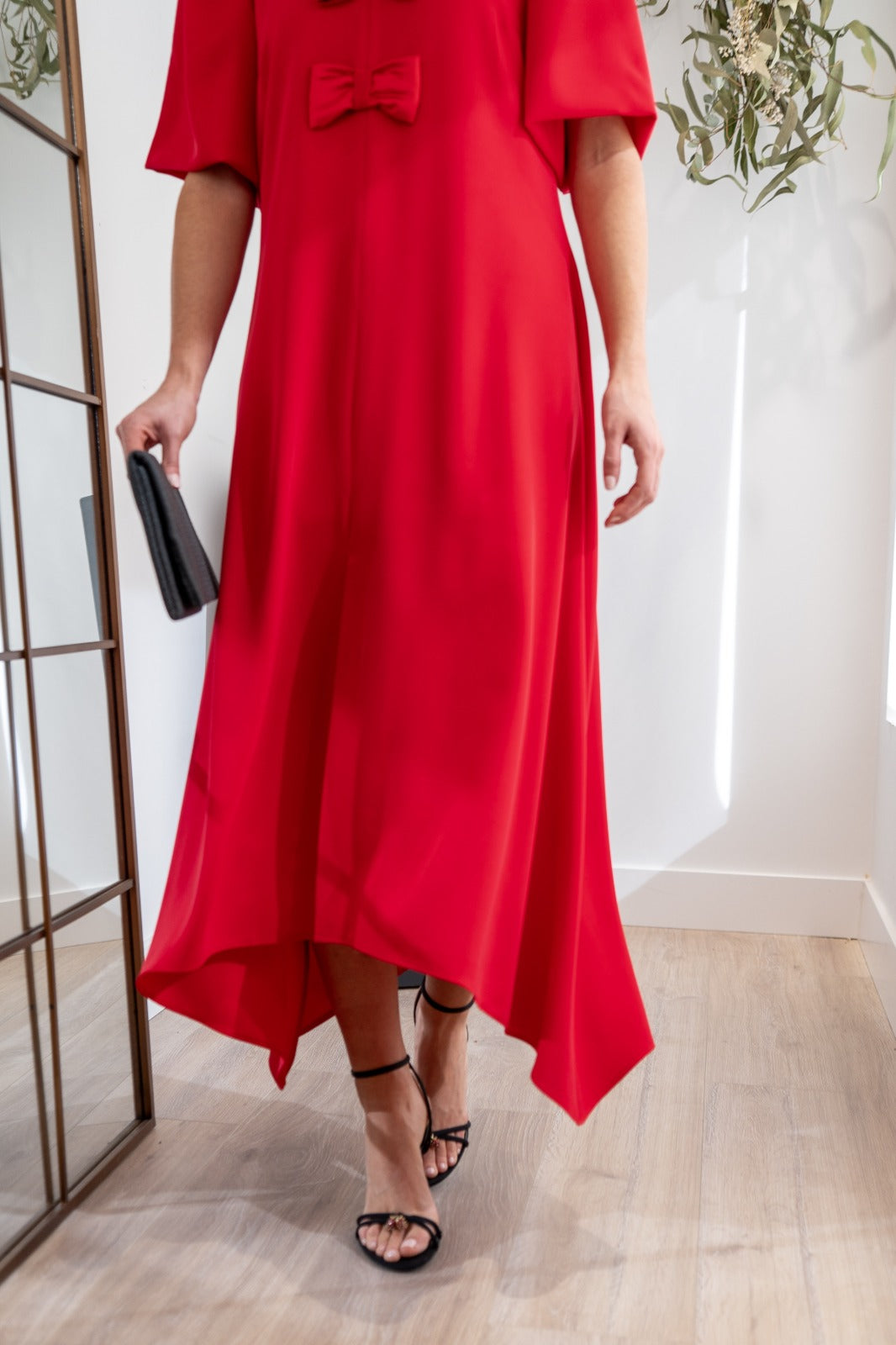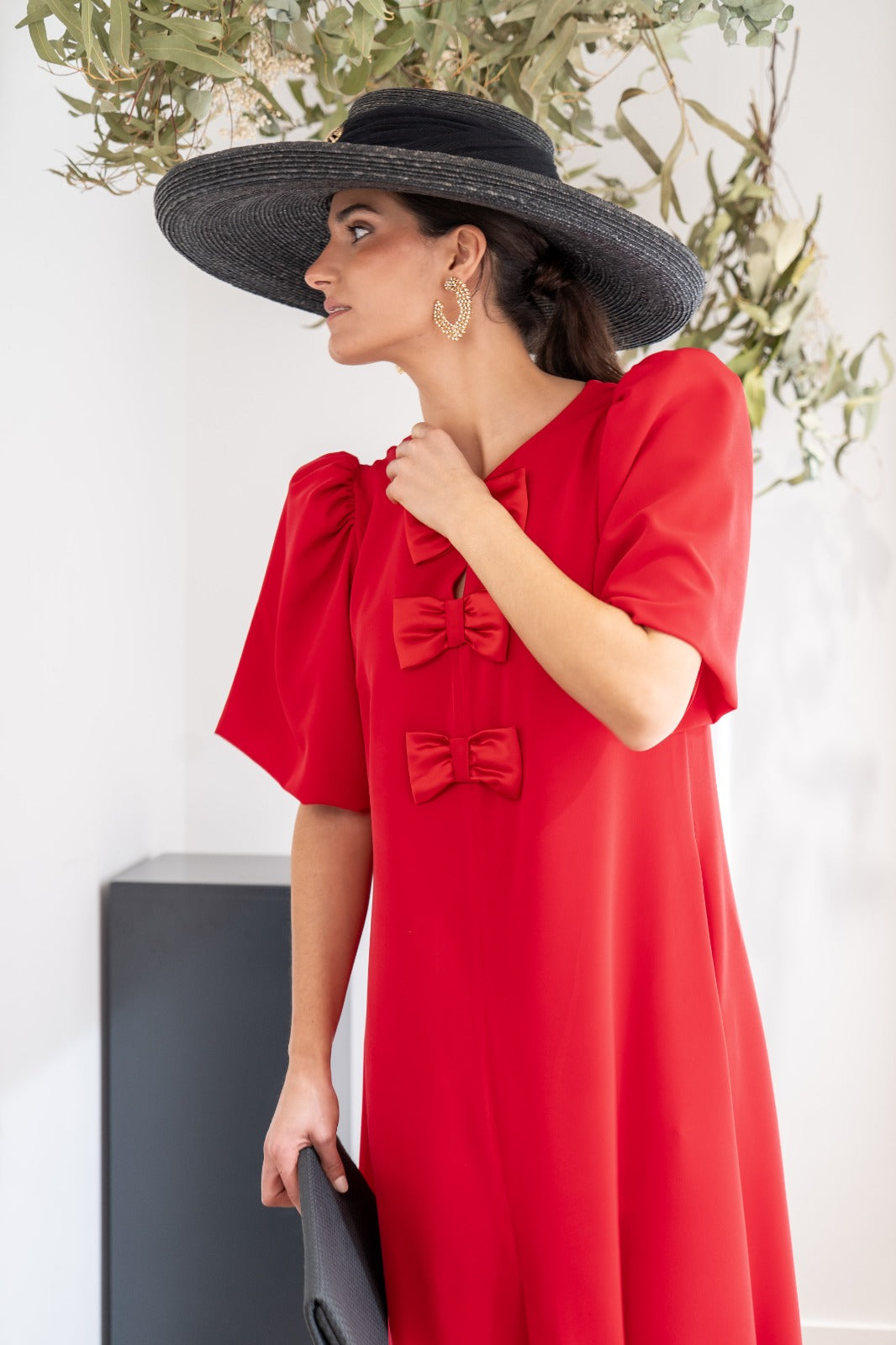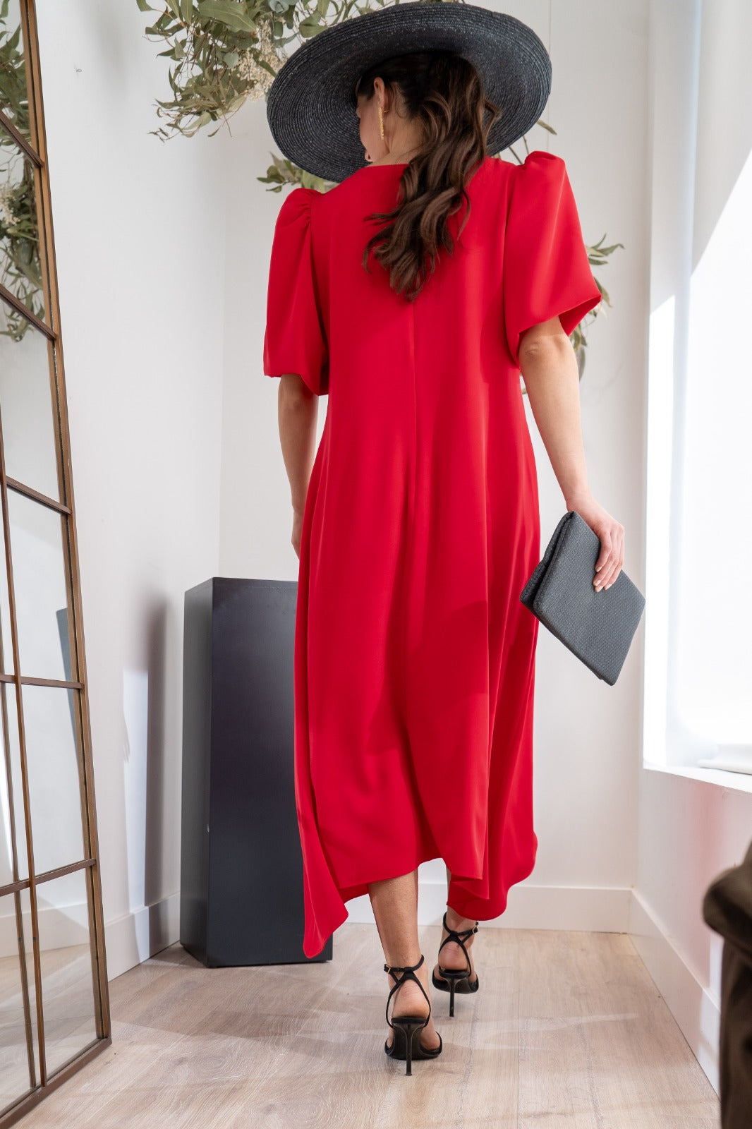 Midi dress, round neckline, wide short sleeves, oversized, front tie detail, shaped at the sides, front slit. In red.