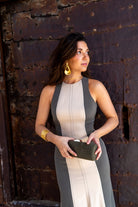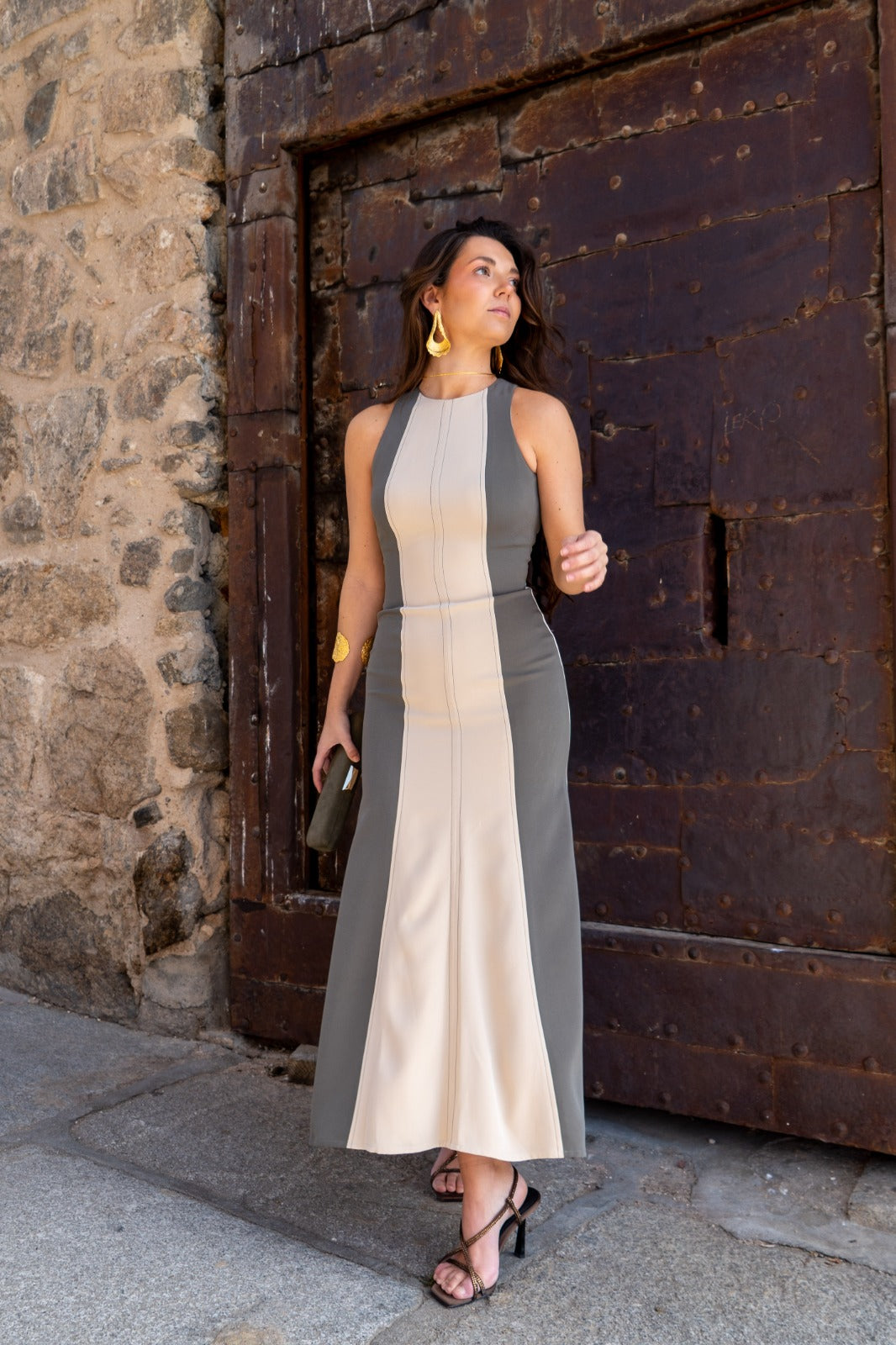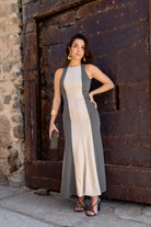 Vestido midi, escote redondo, sin mangas, con cortes verticales que combinan en color, falda con ligero evasé y espalda que deja parte al descubierto. Bicolor beige y verde.