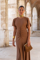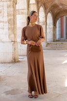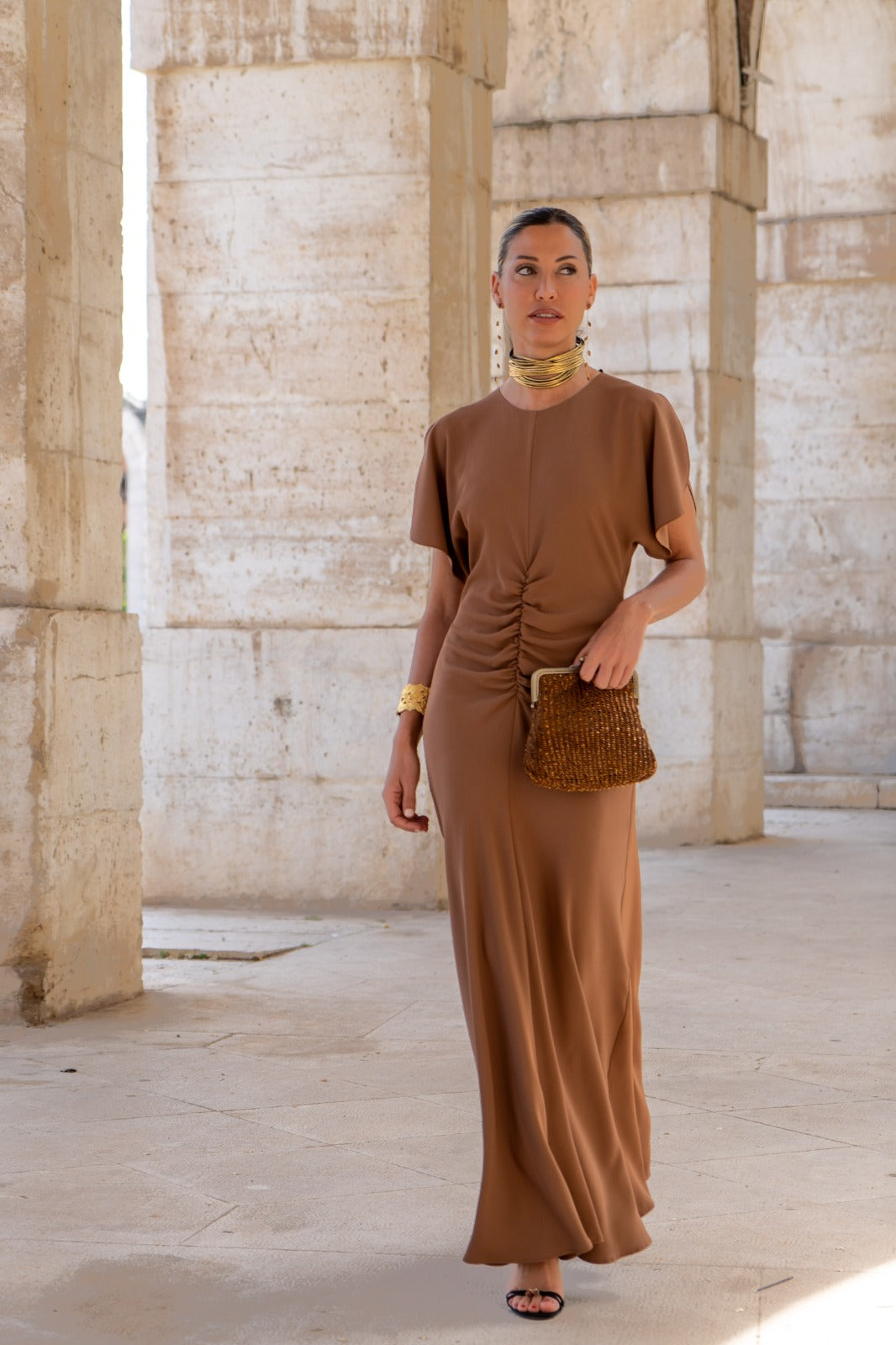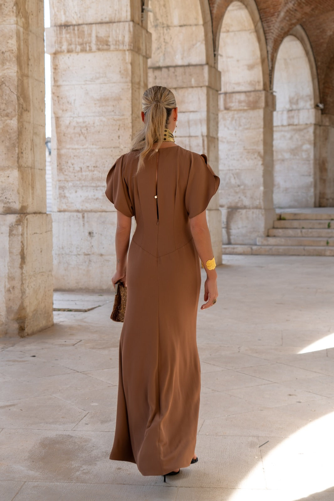 Long dress with round neckline, open short sleeves, gathered at the waist, flared at the bottom. In brown.