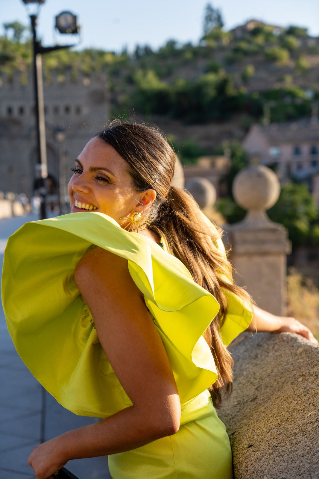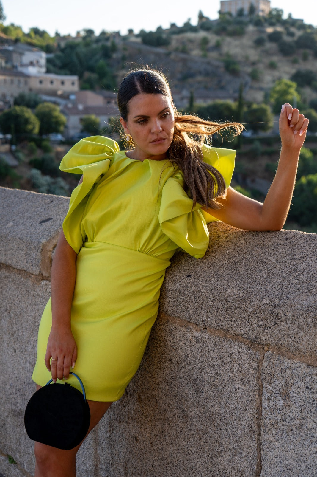 Short dress, round neckline, open back, sleeveless, with maxi ruffles, cut at the waist. In green taffeta.