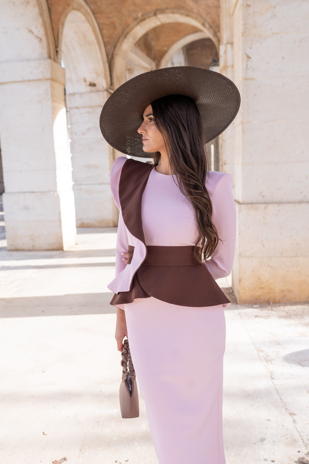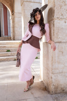 Midi dress, round neckline, three-quarter sleeves, ruffle at shoulder and waist, back slit. Two-tone pink and brown.
