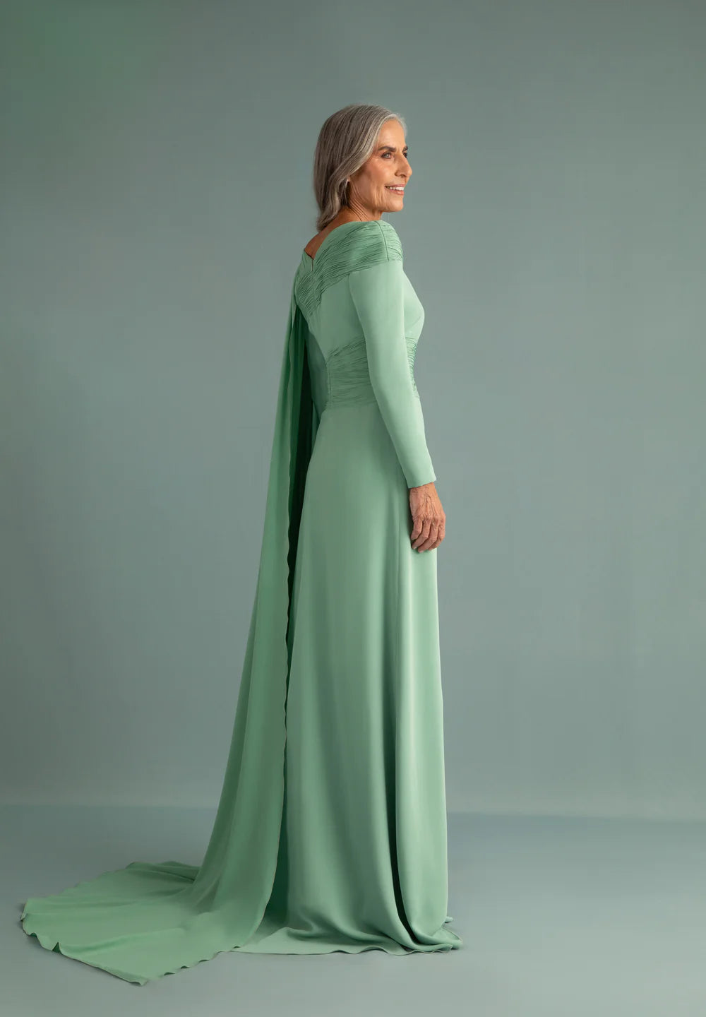 Crepe dress with long sleeves and an asymmetrical neckline that runs along the pieces by Georgette draped by hand, just like the diagonal piece that wraps the waist. A georgette cape that starts at the left shoulder and falls to the floor. In ultramarine blue.